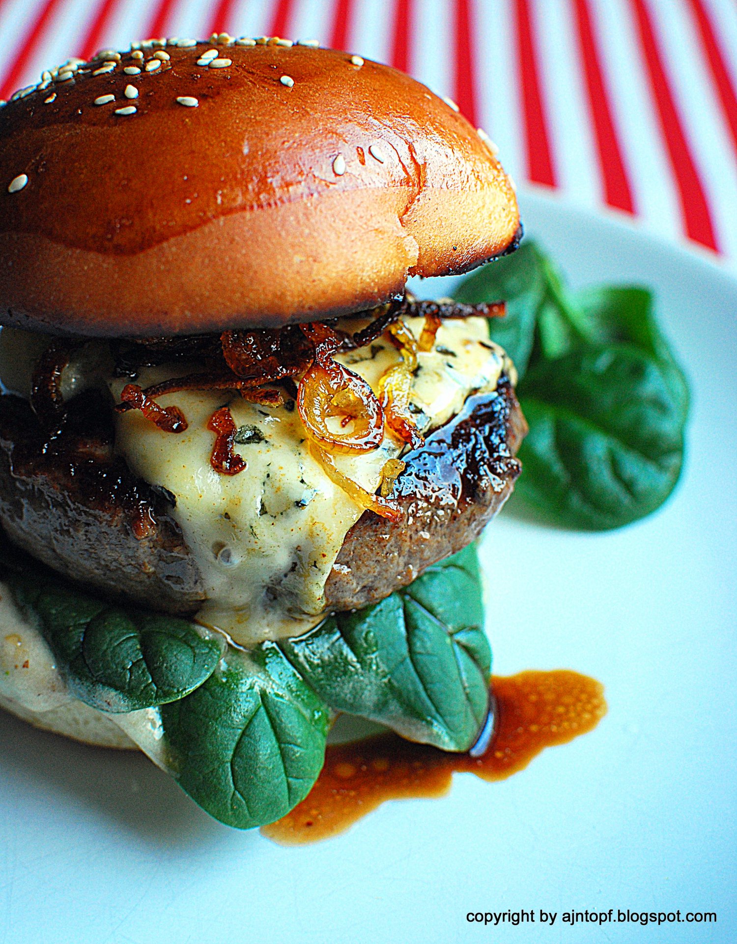 Bułki lekko przysmażcie. Spód bułki posmarujcie sosem, rozłóżcie liście szpinaku, połóżcie burgera, na wierzchu rozłóżcie cebulę i przykryjcie drugą połową bułki. Gotowe. Smacznego!