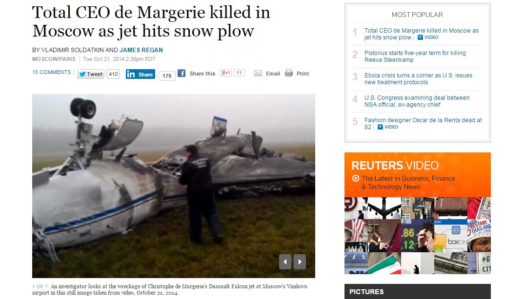 W wypadku zginęły wszystkie (3) osoby towarzyszące prezesowi. Margerie zasłynął z szybkich i owocnych negocjacji na bliskim wschodzie, za co Total był oskarżany przez USA o stosowanie praktyk korupcyjnych.