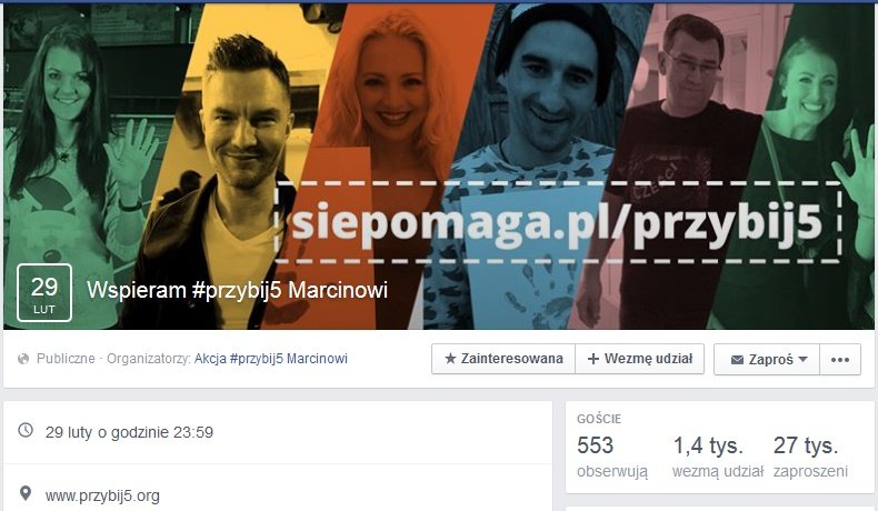 Akcja została zainicjowana przez grupę przyjaciół Marcina, który w wyniku wypadku stracił dłoń. Cel od samego początku był jasny - zebrać 140 tys. złotych na protezę. Głównym medium był przede wszystkim Facebook, na którym szybko pojawiały się nowe fotki z odciśniętą na papierze kolorową dłonią. Każda z nich była wyrazem wsparcia. W akcję zaangażowali się też znani i lubiani, m.in. Justyna Kowalczyk. Do tej pory udało się zebrać 57 tys. Atutem tej akcji jest to, że została zainicjowana i wypromowana przez zwykłych ludzi - codziennych użytkowników Internetu.