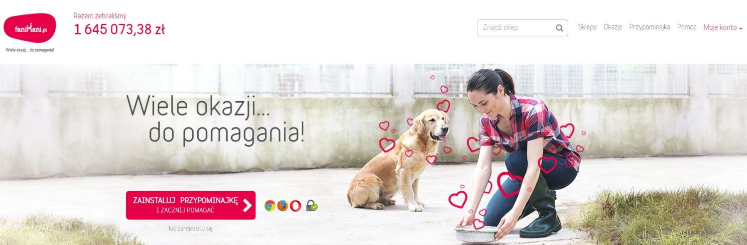 Serwis FaniMani.pl pozwala pomagać w bardzo prosty, bezpieczny i bezpłatny sposób. Wystarczy przejść do swojego ulubionego sklepu przy pomocy specjalnego linku dostępnego na stronie FaniMani.pl. Następnie robimy zakupy tak jak zawsze, ale tym razem część ich wartości trafi do wybranej przez nas organizacji. Kupujący płaci za zakupy tyle co zawsze, ale przy okazji może pomóc wybranej przez siebie organizacji pozarządowej. Z FaniMani współpracuje już ponad 1080 sklepów internetowych oraz 5448 organizacji, które można wspierać przy okazji zakupów online. Wśród zbierających w ten sposób organizacji znajdują się fundacje, stowarzyszenia, harcerze, szkoły, przedszkola, drużyny sportowe i inne inicjatywy społeczne.