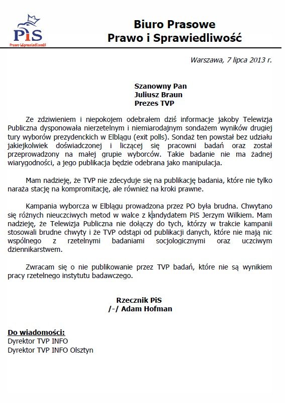 Tuż po zamknięciu lokali wyborczych miał zostać opublikowany sondaż przygotowany dla telewizji polskiej. Nie mógł on mieć najmniejszego wpływu na wynik wyborów, ponieważ w momencie opublikowania ludzie nie mogli już oddawać ważnych głosów. Jednak firma, która ów sondaż przygotowała najwyraźniej nie wzbudziła sympatii polityka PiS, który wystosował list do prezesa TVP Juliusza Brauna w celu zatrzymania tego materiału przed emisją.