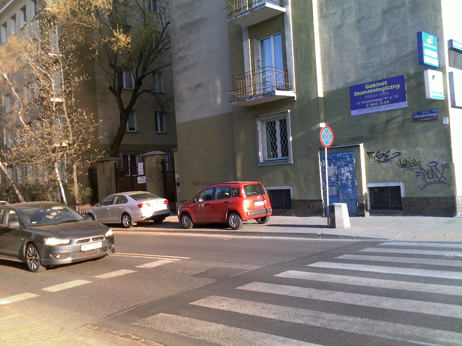 Po pierwsze, szeroka jezdnia sprzyja szybkiej jeździe samochodem. Madalińskiego to jednak z tych wielu w Warszawie lokalnych ulic, na których kierowcy lubią się rozpędzić, bo nic ich do tego nie zniechęca. Po drugie, chodnik wzdłuż ulicy Madalińskiego pomimo obowiązującego zakazu jest gęsto zastawiony przez parkujące samochody. Przestrzeń dla pieszych jest tam ograniczona do tego stopnia, że ludzie muszą czasami zamiast po chodniku chodzić po jezdni ryzykując zdrowie i życie. Pani Bogna, która zgłosiła mi sprawę, jest matką dwójki dzieci, i wychodząc z nimi na spacer, czy odprowadzając jedno z nich codziennie do żłobka, kiedy nie może przejść chodnikiem, zmuszona jest wyjść na jezdnię. Po jezdni muszą chodzić też inne osoby, które nie są w stanie przeciskać się między samochodami – osoby starsze oraz osoby na wózkach. Na tej ruchliwy ulicy spycha się pieszych pod koła pędzących samochodów.