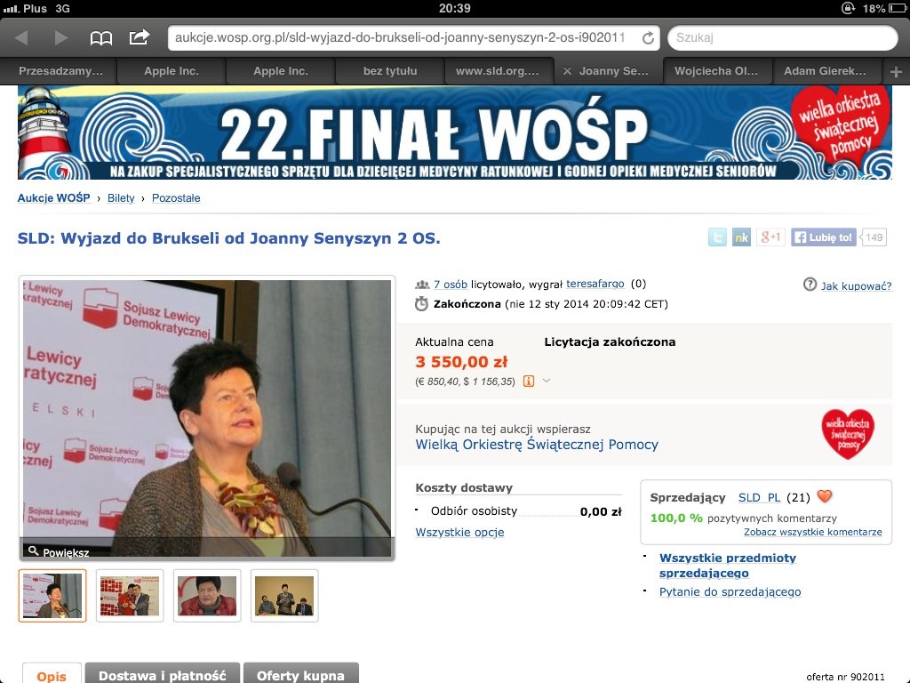 Teresafargo wygrała licytację studyjnego wyjazdu do Brukseli, który przekazałem na organizowaną przez SLD aukcję na rzecz WOŚP. Bardzo się cieszę na spotkanie i serdecznie gratuluję zwyciężczyni, która zdecydowała się przeznaczyć 3550 zł na szlachetny cel wspierania chorych dzieci i seniorów.