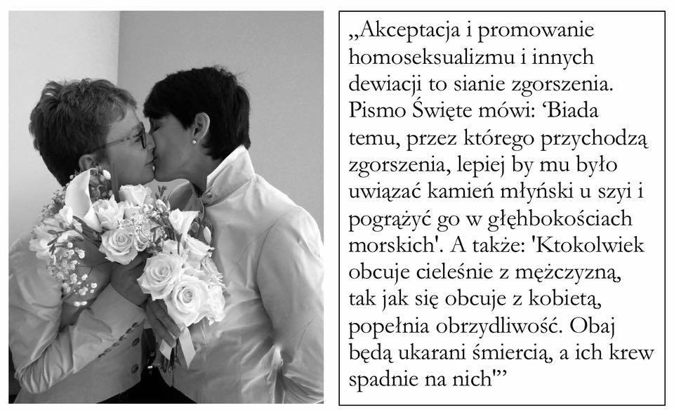 Czytam: Dewiacja, zgorszenie, biada, kamień młyński u szyi, pogrążyć w głębokościach morskich, obrzydliwość, ukaranie śmiercią, skąpani we krwi. To homoseksulaizm według jakiejś strasznej księgi, której autora nikt nie zna, który żył w czasach strasznych wojen, gdzie zwycięzcy brali wszystko, a gwałt na podbitych kobietach był kwnitesencją nagrody. Gdy brakowało kobiet, gwałcono podbitych wojowników. I księga to potępiała najwyraźniej, bo dumnemu wojownikowi nie powinno się robić takich strasznych rzeczy, jakie można robić tylko podbitej kobiecie. Każdej kobiecie, na dobrą sprawę.