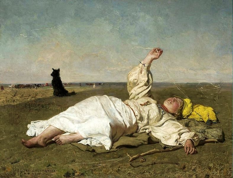 Wylegująca się dziewczyna, pewnie uciemiężona dniem pracy pewnie tego nie rozważała. Ale to uczucie obezwładniającego zmęczenia, gdy z braku sił zapadamy w jakąś bezmyślność wydaje się znane. Czy nie można znaleźć łącznika między jej zabawą babim latem, a współczesnym odstresowującym kolorowaniem rysunkowych zeszytów? Jednak jej zmęczenie jest piękniejsze, bo w pełni wpisane w zachwycający pejzaż.