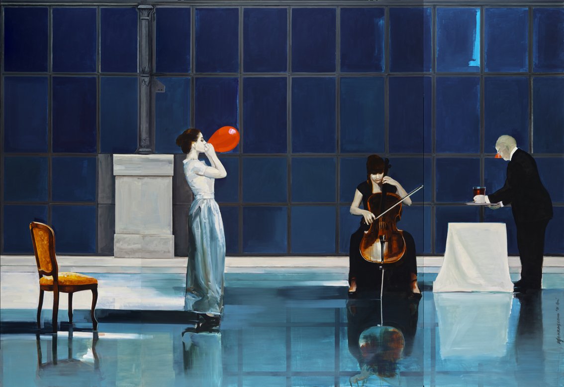W malarstwie Marka Okrassy pomysły rodzą się jakby z atmosfery leniwego popołudnia. Z jakiegoś stanu ospałości przechodzi się w stan kreatywności, jak dziecko spędzające wakacje w domu na wsi, jak Briony z powieści McEwana, czy jak Alicja z opowieści Lewisa Carrolla. Z lenistwa rodzą się pomysły, koncepty, żarty. Sytuacje poważne przeobrażają się w farsy. Ich sceneria staje się sceną teatru, ich bohaterowie- jeżdżą na łyżwach.