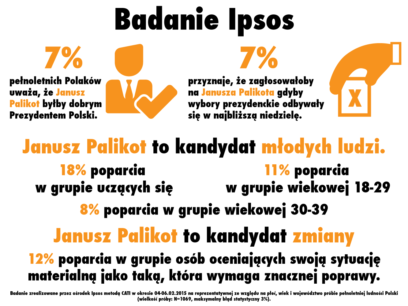 W ostatnich tygodniach Janusz Palikot podróżując po Polsce spotkał się z kilkudziesięcioma tysiącami Polaków. Bardzo pozytywny odbiór ze strony ludzi i życzliwe komentarze skłoniły lidera Twojego Ruchu i kandydata na Prezydenta Polski do weryfikacji swojego poparcia. W okresie 04-09.02.2015 kilka ośrodków badawczych przebadało, w oparciu o jednakową metodologię, reprezentatywną grupę dorosłych Polaków. Pozwoliło to uzyskać materiał porównawczy i w obiektywny sposób zweryfikować rzeczywiste poparcie dla Janusza Palikota kandydującego w wyborach prezydenckich.