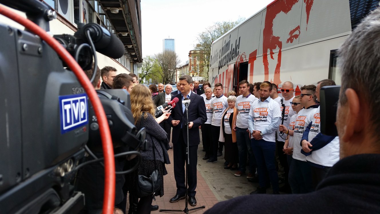 Kandydat Twojego Ruchu na Prezydenta pod siedzibę Prawa i Sprawiedliwości podjechał specjalnie obklejonym autobusem, nazwanym już przez sztab Palikotobusem. Wraz z politykiem przyjechali także licznie zgromadzeni sztabowcy, którzy do 8 maja będą podróżować po całej Polsce z liderem Twojego Ruchu.
