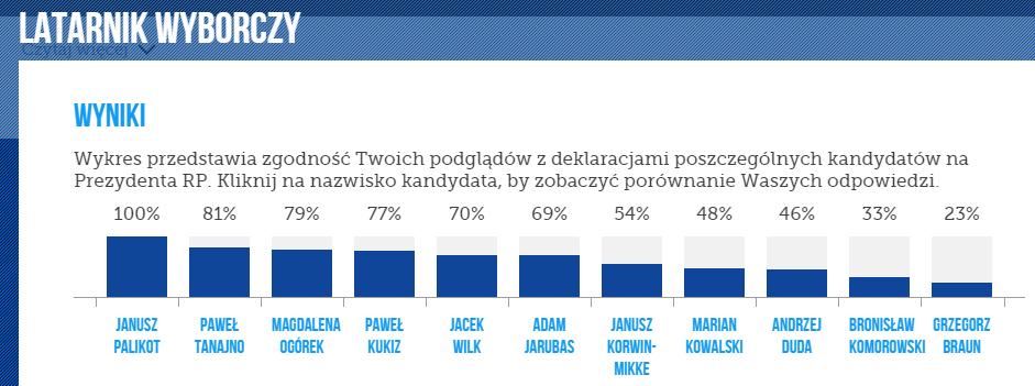 na:TematWyborySprawdź swoje preferencje wyborcze!Kampania PALIKOTA 23 kwietnia 2015, 21:37·1 minuta czytaniaPublikacja artykułu: 23 kwietnia 2015, 21:37Nie wiesz na kogo oddać swój głos 10 maja?REKLAMA Wejdź na stronę www.latarnikwyborczy.pl, odpowiedz na pytania i sprawdź, który z kandydatów prezentuje poglądy zbliżone do Twoich!Nie przegap żadnej ważnej wiadomości i obserwuj nas w Google News! Udostępnij Kampania PALIKOTAObserwuj Kampania PALIKOTAObserwuj