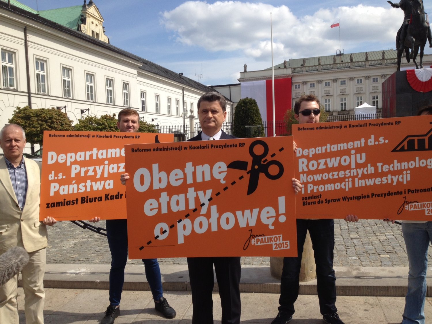 Na konferencji prasowej pod Pałacem Prezydenckim lider Twojego Ruchu przedstawił propozycje zmian, jakich chciałby dokonać po objęciu najwyższego urzędu w państwie. – Kancelaria Prezydenta Komorowskiego jest jedną z najdroższych w Europie, a jednocześnie jedną z tych z najmniejszymi uprawnieniami. Moja kancelaria wyglądałaby tak: połowa urzędników i kosztów oraz zupełnie inna organizacja. Zamiast departamentu pisania przemówień (jak dziś) proponuję departament przyjaznego państwa – mówił Janusz Palikot.