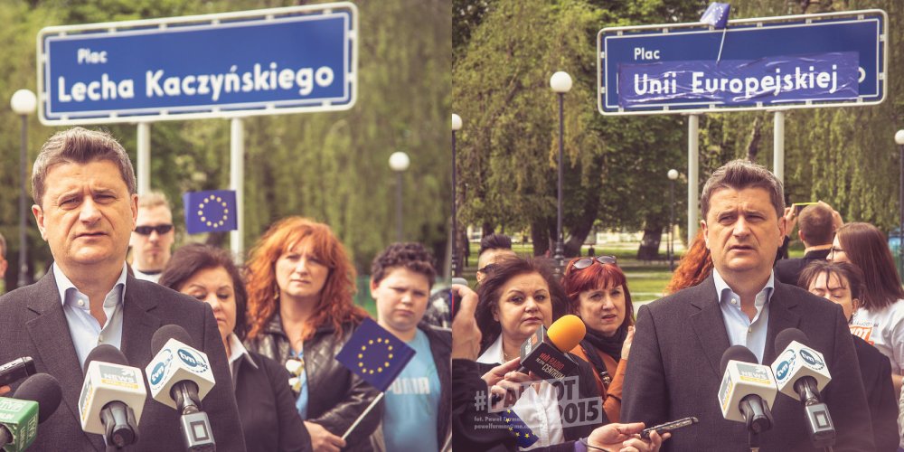 - Nie rozumiem, dlaczego Lecha Kaczyńskiego tak się gloryfikuje. Był beznadziejnie słabym prezydentem. Nie mogę zaakceptować, że człowiekowi, który odpowiada za śmierć wielu osób w katastrofie, stawia się pomniki, nazywa się jego nazwiskiem ulice czy place – powiedział Janusz Palikot podczas konferencji prasowej zorganizowanej na Placu im. Lecha Kaczyńskiego w Lublinie. Nasz kandydat na prezydenta tuż przed konferencją symbolicznie zmienił nazwę placu Lecha Kaczyńskiego na plac Unii Europejskiej, zaklejając tabliczkę z nazwą placu. Lider Twojego Ruchu zapowiedział, że w poniedziałek wystąpi do prezydenta Lublina z wnioskiem o zmianę nazwy, a podobne dokumenty mają zostać złożone także w innych polskich miastach, w których są place i ulice nazwane imieniem byłego prezydenta.