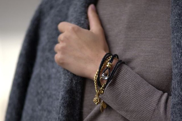 Moja rada na spotkanie z przyjaciółką: Szlachetne szarości i kolory ziemi uzupełniaj nietypowymi połączeniami biżuterii w ciepłej kolorystyce: bransoletki ze skórzanymi elementami przełamuj delikatnymi kolczykami, a geometryczne formy na naszyjniku wzmacniaj bransoletką w stylu etno.