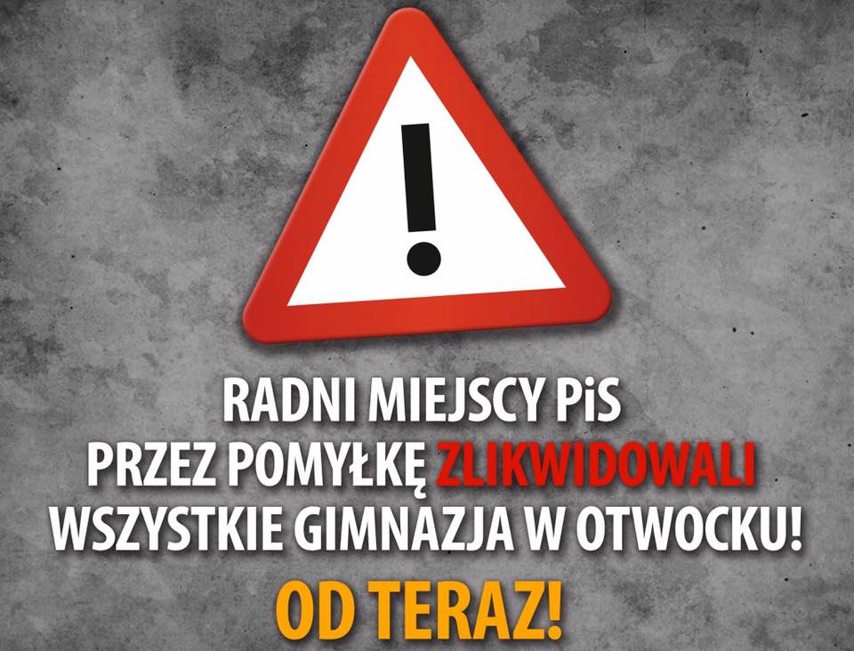 Radni PiS z Otwocka zlikwidowali przez pomyłkę wszystkie gimnazja już teraz pomimo, że nie skończył się jeszcze rok szkolny oraz zostaną do 2019 roku jeszcze dwie klasy gimnazjów. W związku z czym będzie problem z wydaniem świadectw na zakończenie roku gimnazjalistom z Otwocka czy funkcjonowaniem klas 2-ich i 3-ich do 2019.