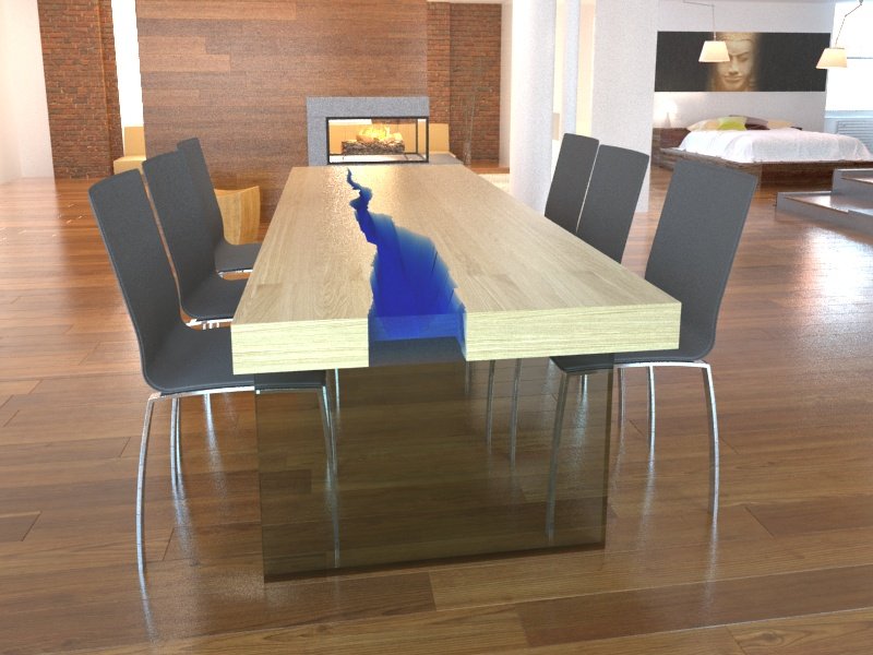 Wyjątkowe w stołach Kasparo jest wykorzystanie diod ledowych oraz czujników ruchu, uaktywniających świetlny pokaz przy każdym wejściu do pomieszczenia. Całość daje niesamowity efekt, jak gdyby po gładkiej powierzchni drewnianego blatu spływał strumyk wody, zmieniający się następnie w ogromny wodospad spadający po szklanej ścianie.