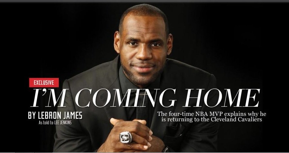 (…) Zawsze wierzyłem w to, że wrócę do Cleveland i zakończę tu moją karierę. Nie wiedziałem tylko kiedy to się stanie. Po zakończeniu sezonu nawet nie myślałem o wolnej agenturze. Ale mam dwóch synów i żonę, Savannah, która jest w ciąży. Zacząłem się zastanawiać jak to by było móc żyć w rodzinnym mieście. Patrzyłem na możliwości jakie dają mi inne drużyny, ale nie zamierzałem opuścić Miami i przejść do jakiegokolwiek innego miasta z wyjątkiem Cleveland. Im więcej czasu mijało, tym bardziej czułem, że postępuję słusznie. To mnie uszczęśliwia. (…)Wracam do domu!