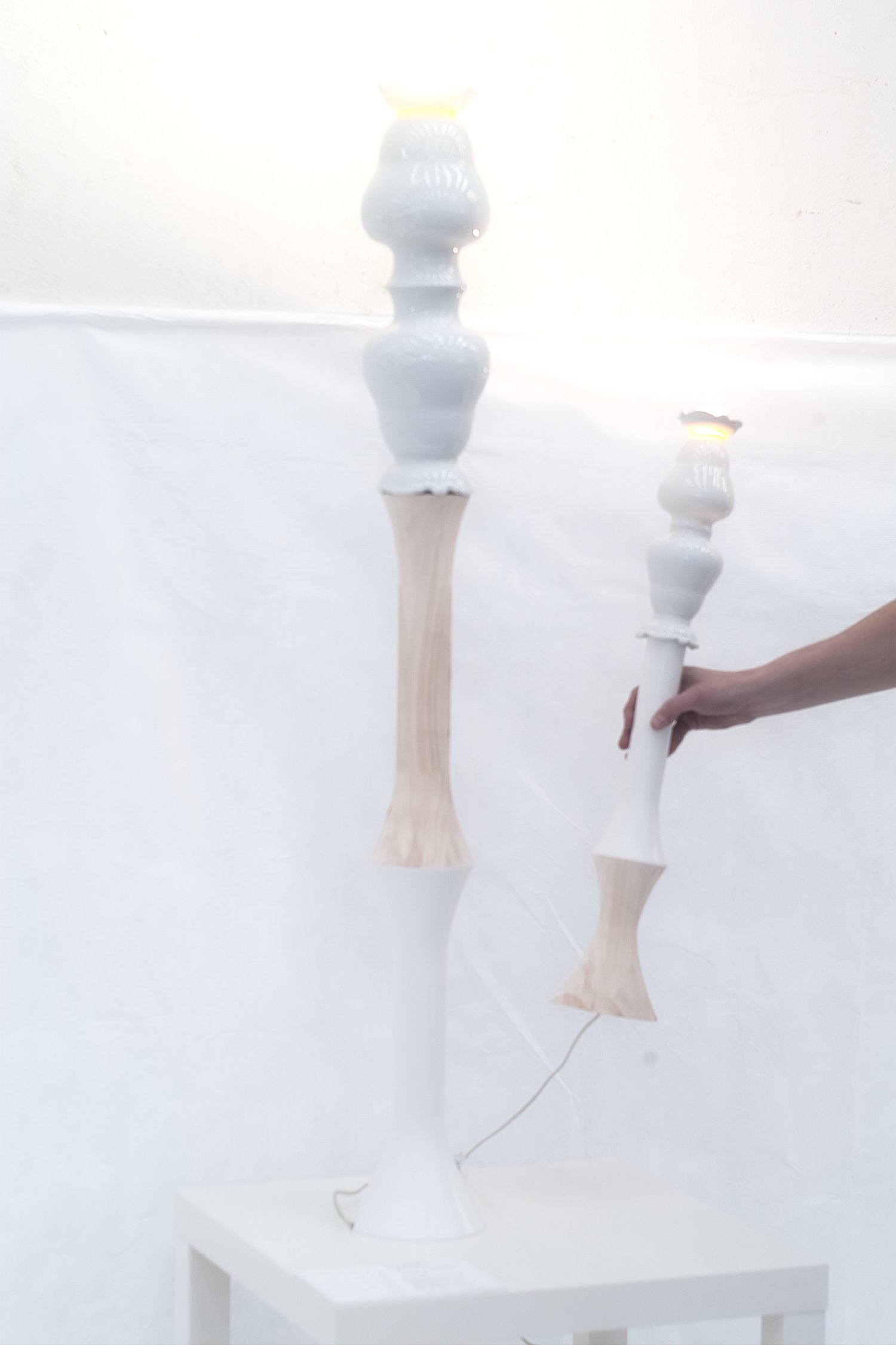 Lampy porcelanowe to dwa modele: Twins i Lacetrace. Twins to lampa będąca kompilacją litego drewna dębowego z porcelanowym kloszem- który polega na przetworzeniu tradycyjnego fasonu i dostosowania go do designu tej lampy. „Bliźniaki“, można rozdzielać traktując je albo jako jedną lampę podlogową o dwoch modułach, albo jako podłogową i nocną. Porcelana w piękny sposób przepuszcza światło . Druga lampa, to ślad wzorów koronek wypalonych w strukturze porcelany. W efekcie powstała delikatna porcelanowa materia , którą zestawiliśmy z podobną linią wytoczoną w litym drewnie. Lacetrace to wspomnienie wzorów typowych firan, przetworzony we współczesny sposób. Jednocześnie lampy mają za zadanie zademonstrowanie możliwości tradycyjnego rzemiosła, w odniesieniu do efektów uzyskiwanych dzięki nowoczesnym technologiom.