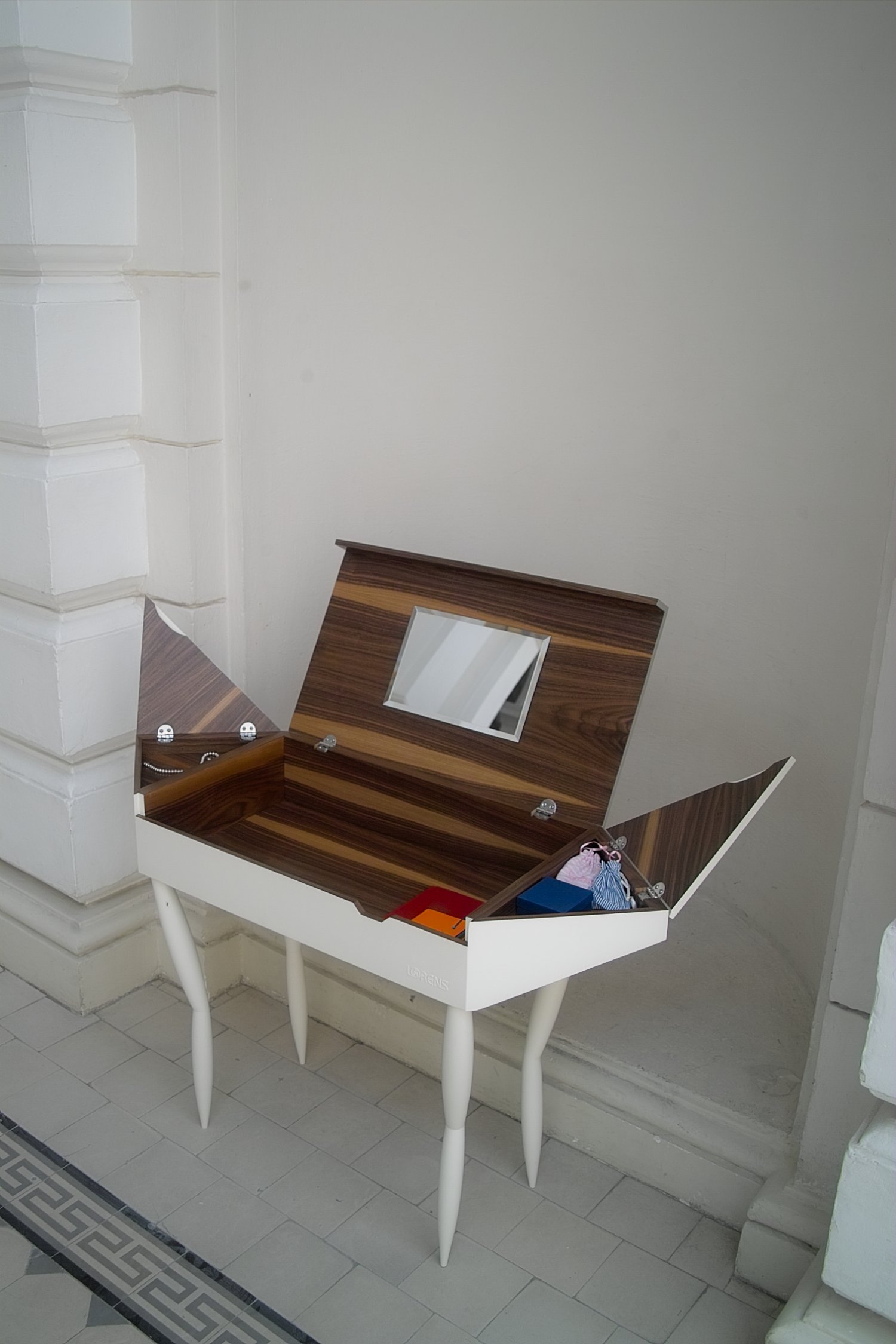 4. Adam to wersja męska – stół przeznaczony do pracy w domu, Eve to damska – czyli toaletka. Jakkolwiek „płeć” sekretarzyków określa tylko ich funkcjonalną specyfikę, a nie użytkownika, można rozpoznać je po delikatnych różnicach w formie i ustawieniu nóżek (damski – smukłe wygięcie, męski – bardziej masywna „sylwetka”). Podobnie jak w przypadku stołu Cloud, materiał i kolory są w pełni dowolne w odniesieniu do wnętrza.