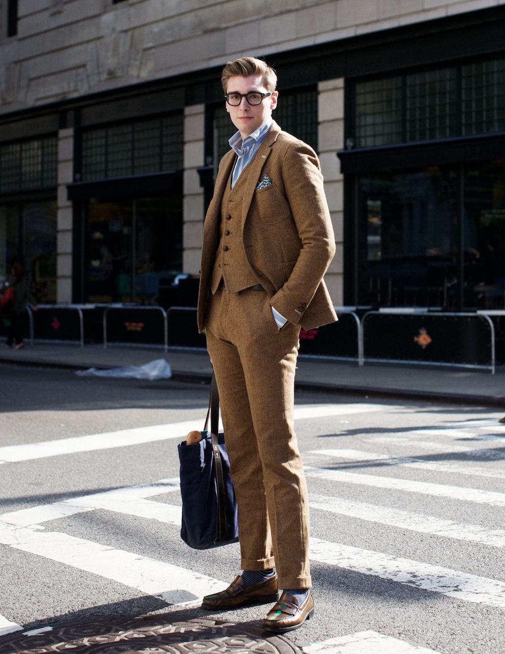 Poszedłbym na całość i zamówił garnitur tweedowy. Nie flanelowy, tylko tweedowy właśnie. Z szarej lub brązowej jodełki. W dodatku z kamizelką. Spodnie bez zaszewek i z bardzo wąskim mankietem. Takim dosłownie na 2 cm. (wiem, brzmi dziwnie).