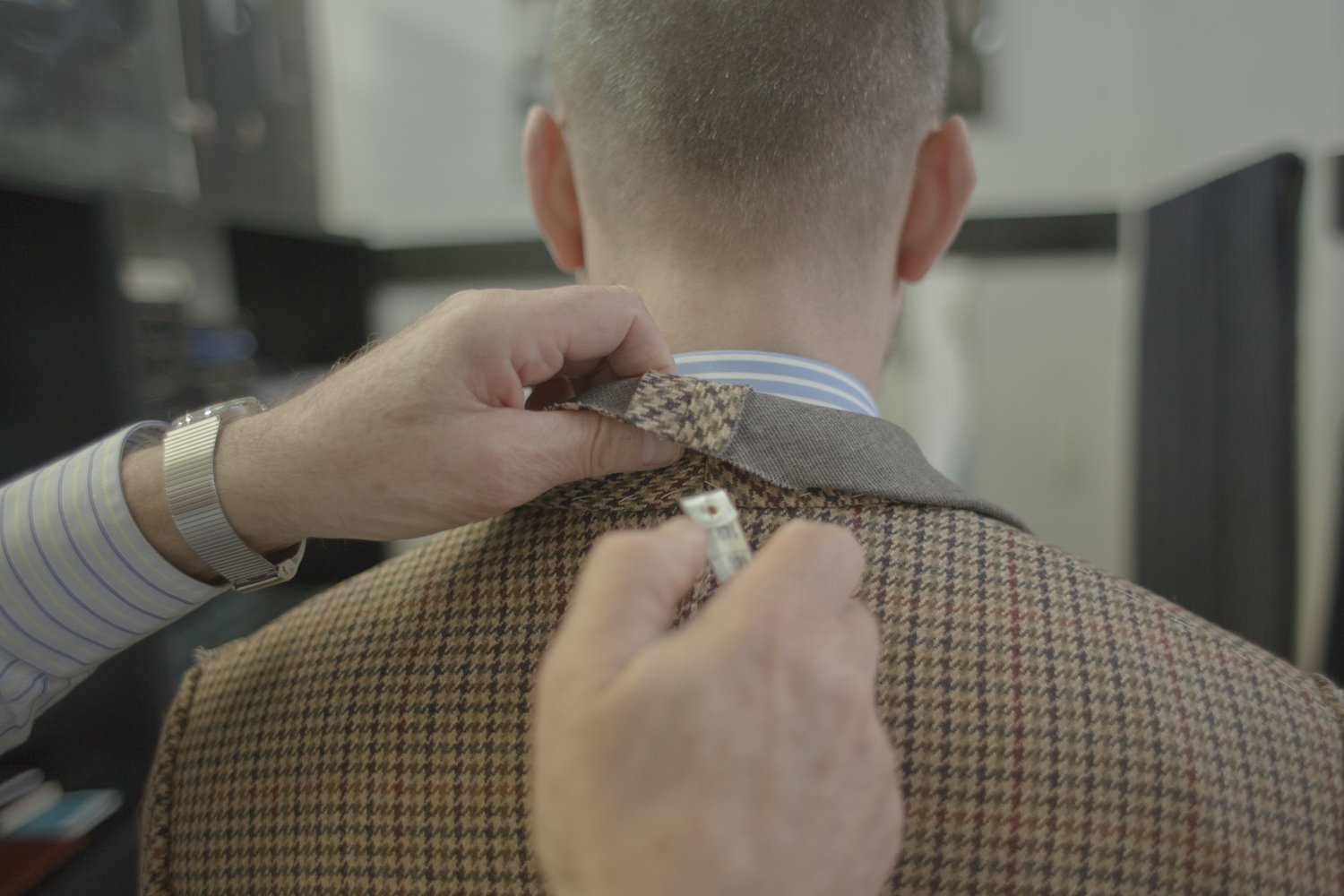 I teraz uwaga- Jeśli badając marynarkę w tym punkcie zobaczysz, że jest za obszerna, to można ją poprawić. Krawiec manipulując szwami biegnącymi po bokach i na plecach jest w stanie dopasować zbyt obszerną marynarkę.