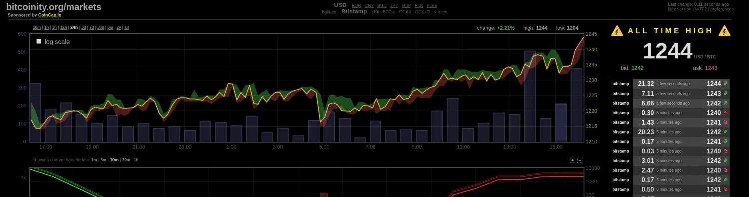 Cena cyfrowej waluty Bitcoin (istniejącej od 2009 roku), będącej wiodącą, globalną, zdecentralizowaną implementacją protokołu i bazy danych blockchain osiągnęła dziś najwyższą historycznie wartość = 1244 USD na giełdzie Bitstamp.