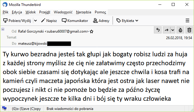 postanowiłem ponownie podjąć kroki prawne. Uznałem, że to jednak przekracza granice głupiego hejtowania w necie i stanowi realne groźby podlegające pod kategorię gróźb karalnych. Zgłosiłem się na lokalny komisariat policji, dostarczyłem pełne nagłówki maila, z których łatwo można było ustalić, skąd wiadomość została nadana i jaką drogą przemieszczała się do adresata. W razie nawiązania kontaktu z operatorami i dostawcami usług internetowych można by ustalić tożsamość nadawcy a przynajmniej wskazać precyzyjnie skąd, kiedy, w jaki sposób swoje groźby w moją stronę wysłał.