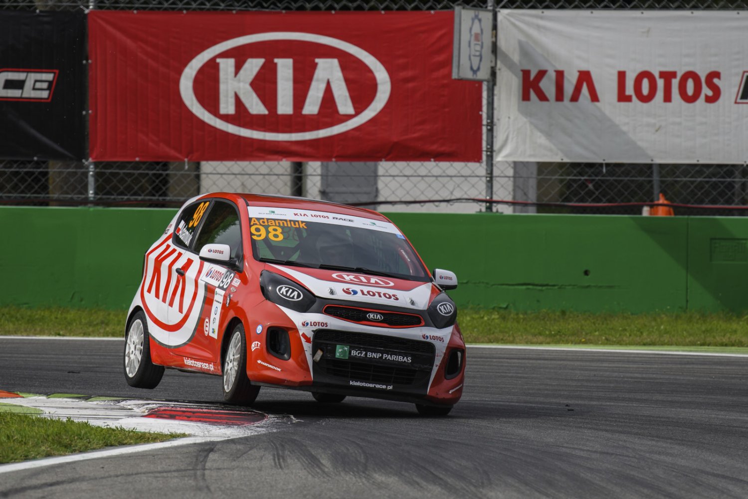 W trzecim treningu przeginam. Za duża prędkość w pierwszym zakręcie Lesmo, wylatuję w żwir, stawia mnie bokiem i uderzam przodem w bandę po wewnętrznej. Fatalne uczucie, kiedy siedząc za kierownicą, w pewnym momencie uświadamiam sobie, że jestem już tylko pasażerem. Uszkodzenia nie są wielkie, ale naprawa wymaga czasu. Nie wyjeżdżam już na czwarty trening, a mechanicy reanimują auto na kwalifikacje następnego dnia. Czapki z głów, bo Picanto jeździ jak nowe!