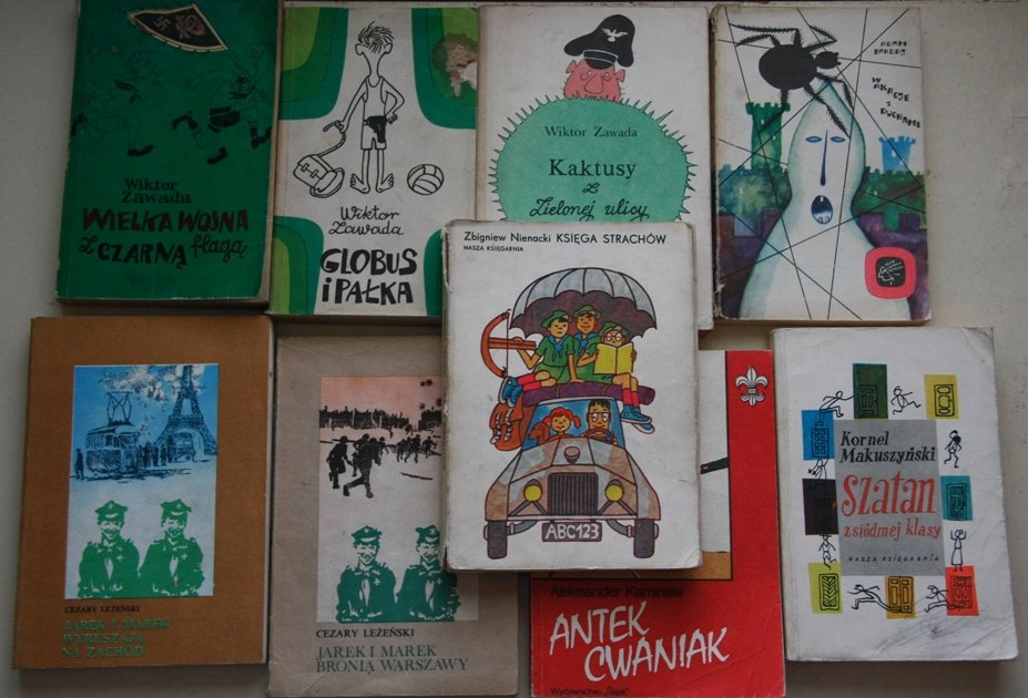 Po pierwsze trylogia Wiktora Zawady o wesołych urwisach z Zamościa z czasów hitlerowskiej okupacji – moje ówczesne mistrzostwo świata. Czytałem po kilka razy z wypiekami na twarzy. Na zdjęciu brakuje „Leśnej szkoły strzelca Kaktusa”, bo książka ta została przeze mnie zajechana na amen. Muszę to sobie jeszcze kiedyś przypomnieć!