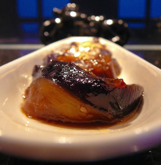 Na suchej patelni prażymy na małym ogniu sezam, kilkukrotnie potrząsając patelnią. W woku lub szerokim płytkim garnku na rozgrzanym oleju przesmażamy czosnek z imbirem i chili. Kiedy zapachną, dorzucamy bakłażany. Zalewamy sosem sojowym, ostrygowym i olejem sezamowym, dodajemy miód. Mieszamy. Przykrywamy i dusimy ok. kwadransa do dwudziestu minut, kilkakrotnie mieszając.