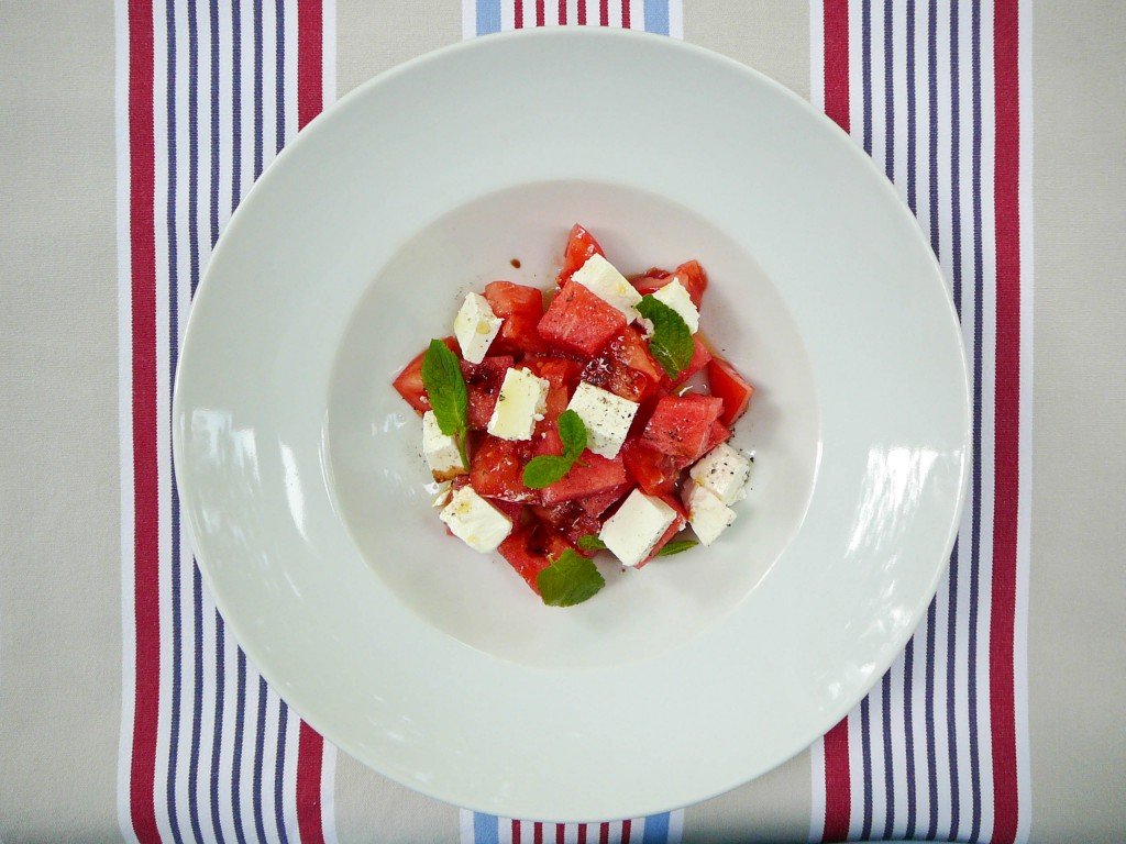 Jedną z moich ulubionych pozostaje sałata z arbuza, malinowych pomidorów i sera feta. W celu jej przygotowania kroimy w dużą kostkę (identyczną dla obu produktów) obrane pomidory malinowe i arbuza (wypestkowanego, jeśli przeszkadzają nam pestki). Dodajemy kostki fety, polewamy obficie intensywną w smaku oliwą z oliwek z pierwszego tłoczenia, doprawiamy grubo zmielonym czarnym pieprzem i solą morską, ozdabiamy listkami świeżej bazylii i gotowe.