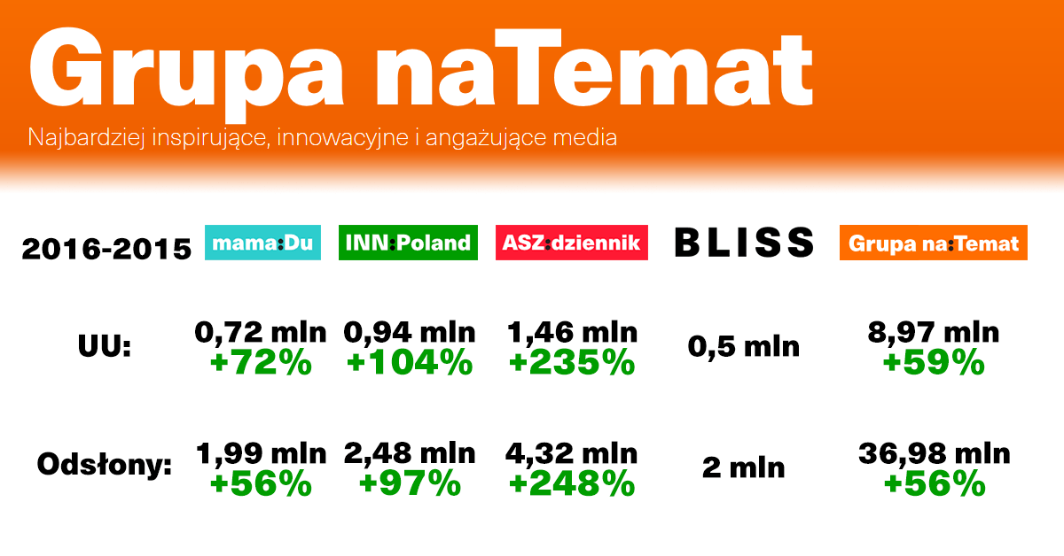 BLISS to część lifestylowa serwisu naTemat i jednocześnie najmłodszy serwis Grupy, który premierę miał na początku maja tego roku. Po niespełna trzech miesiącach serwis odnotowuje blisko 2 miliony odsłon i cieszy się dużym zainteresowaniem wśród reklamodawców.Wydawany przez Grupę magazyn parentingowy MamaDu urósł natomiast o 72 procent względem roku poprzedniego.