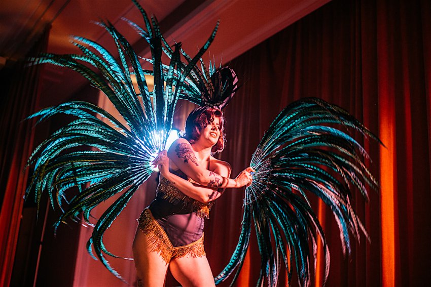 Burleska pozwala też mężczyznom odnaleźć się w kanonach kobiecości. Jedyny facet, który w ramach festiwalu występował na scenie – Trash Valentine – dał pokaz ubrany tylko w... wachlarze z piór. Artysta naprawdę nazywa się Blake, przyjechał z Australii i ma polskie korzenie. – Mój ojciec wyemigrował z Polski w czasach PRL-u – tłumaczy mi Blake. – Jest ze mnie bardzo dumny i wspiera mnie w moich działaniach artystycznych.