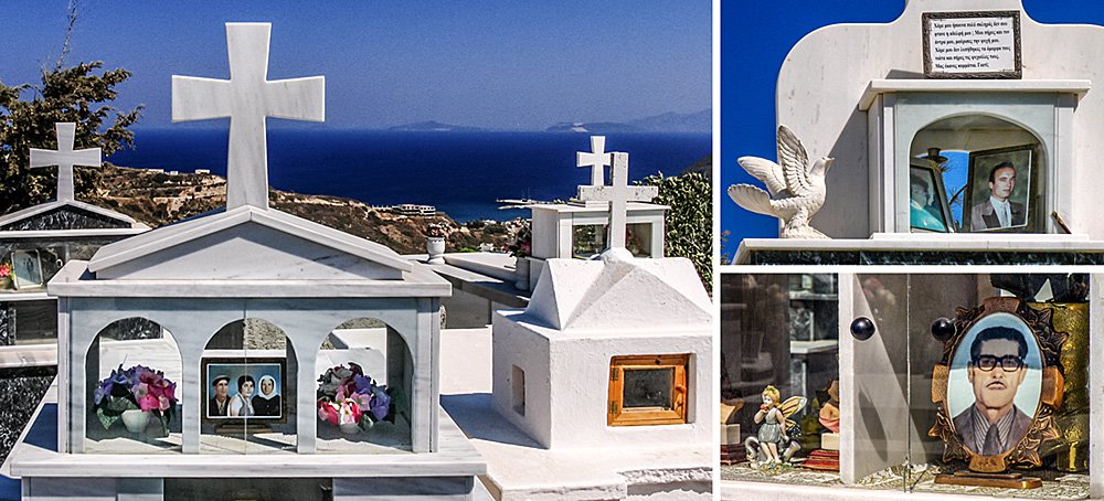 W Polsce darzymy zmarłych szacunkiem. Nie można o zmarłych mówić źle oraz nie wypada 1 listopada nie odwiedzić rodzinnych grobów. Ale fotografii na polskich nekropoliach jest niewiele. Gdzieniegdzie można spotkać małe zdjęcia w kolorze sepii lub czarno-białe. Są to oficjalne ujęcia, najczęściej te same co do dowodu lub paszportu. Zupełnie odwrotnie jest w Grecji. Rzadko można spotkać nagrobek bez zdjęcia, często jest ich po kilka sztuk. Prawie wszystkie są kolorowe. W pomnikach robione są na fotografie specjalne wnęki z zasuwaną szybą, jak miejsca na kryształy w starych kredensach.