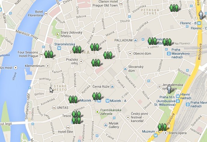 Plac Jana Palacha (a raczej Kaprova, pod stacją metra Staromestska - tu trzeba oddać sprawiedliwość – leją tam w zasadzie tylko konie, kiedy dorożka zatrzymuje się na światłach, jakaś żyła wodna?) Studenci wiedzą o co chodzi.