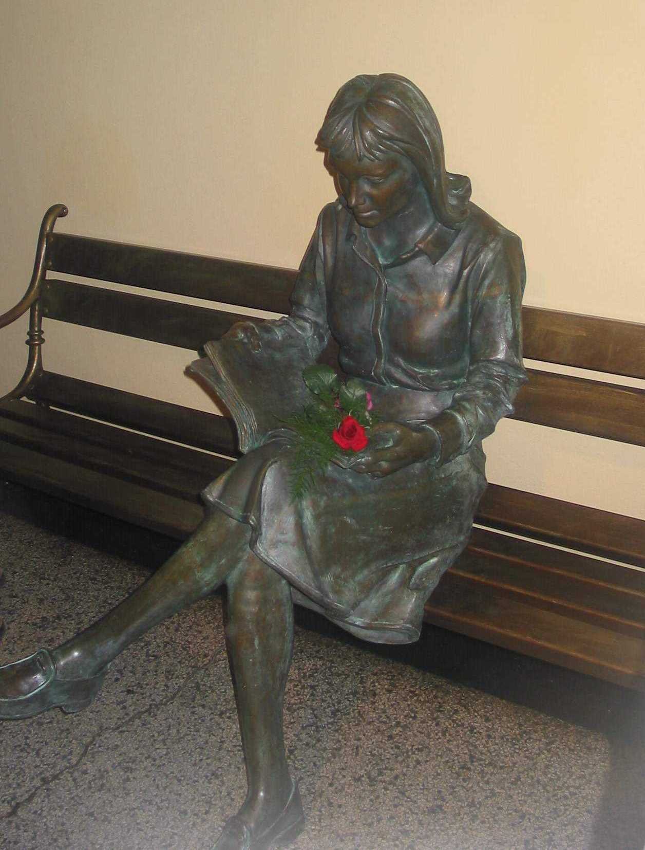 Na AGH (to taka duża uczelnia techniczna mieszcząca się w Krakowie - wyjaśniam, gdyby ktoś nie wiedział :-) ) pośród wielu eksponatów technicznych rozmieszczonych na terenie całej uczelni (lokomotywa, kolejka linowa, fragment wieży wyciągowej kopalni itp.) jest jedna bardzo kameralna rzeźba studentki siedzącej na ławce i pilnie się uczącej z trzymanego zeszytu.