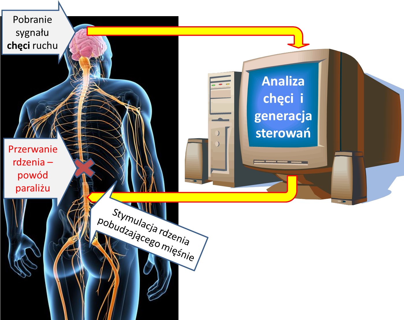 Sygnały z mózgu, odpowiednio przetworzone, przeanalizowane i zinterpretowane przez system komputerowy, wykorzystano do generowania sygnałów sterujących robota (egzoszkieletu), który poruszał ciałem sparaliżowanego człowieka. Człowiek ten odzyskał dzięki temu zdolność wykonywania pewnych ruchów, chociaż tak naprawdę ruchy te wykonywał robot, troskliwie obudowany wokół jego sparaliżowanego ciała.