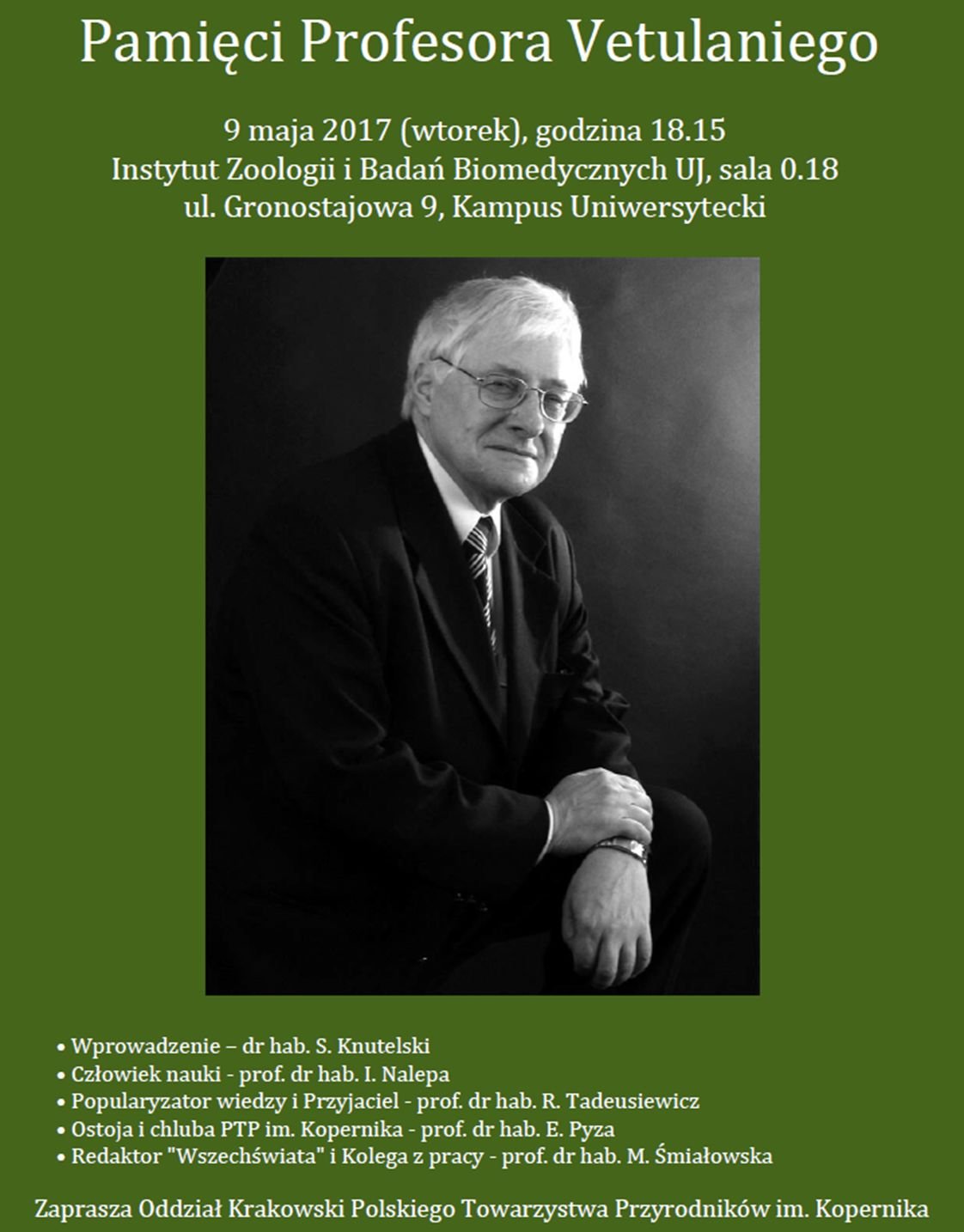 Pisałem już o nim na tym blogu, ale dziś chcę wrócić do tego tematu, ponieważ w najbliższym czasie przyjaciele Zmarłego podejmować będą różne działania, które tego wspaniałego Człowieka mają przypomnieć i utrwalić w społecznej pamięci. Niniejszy wpis ilustruje replika plakatu zapraszającego na wieczór wspomnieniowy, jaki na kampusie UJ odbędzie się w dniu 9 maja. Profesor Vetulani ma być podczas tego wieczoru wspominany jako człowiek nauki, popularyzator wiedzy i wspaniały Przyjaciel, ostoja i chluba Polskiego Towarzystwa Przyrodników imienia Kopernika, a także jako redaktor "Wszechświata" i kolega z pracy. Taki sposób wspominania Zmarłego bardzo mi odpowiada, bo pokazuje, jak wielowymiarową osobowością był profesor Vetulani. Żałuję tylko, że zabraknie w tej prezentacji wątku związanego z działalnością artystyczną Profesora. A przecież był On jednym z założycieli słynnej "Piwnicy pod baranami", w której pełnił rolę konferansjera na równi ze wspaniałym Piotrem Skrzyneckim! Garść wspomnień o tym jego kolejnym "wcieleniu", przedstawiona przez znanych i lubianych do dziś artystów "Piwnicy", z pewnością wniosłaby do tego spotkania istotny dodatkowy wymiar.