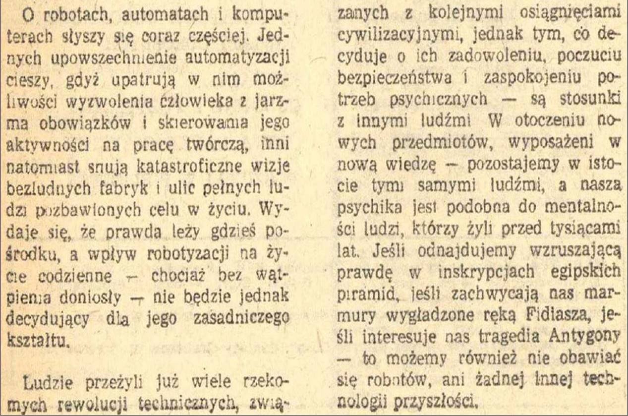 Udostępniam je w serwisie Academia.edu i mam nadzieję, że czasem ktoś do tego serwisu zajrzy, chociaż pierwsze wejście do niego najeżone jest trudnościami, które opisałem w tym wpisie na blogu, używając nawet żartobliwej metafory "ścieżki zdrowia". Ale czasem przy wprowadzaniu tych starych tekstów zauważam, że mimo upływu lat wcale się tak bardzo nie zestarzały. Na przykład, tekst przywołany wyżej w postaci obrazka jest wstępem do artykułu "Zmysły dla robota", wydrukowanego w marcowym numerze miesięcznika "Wiedza i Życie" z 1986 roku. Pisałem to ponad 30 lat temu - a tekst wydaje się zadziwiająco aktualny...