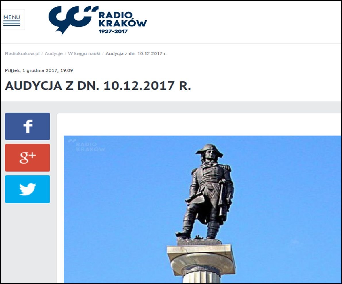 Ten cykl moich wystąpień na temat inżyniera Kościuszki domknie jutro (w niedzielę, 10.12.2017) audycja w Radiu Kraków - nadawana jak zwykle po hejnale, w ramach cyklicznej audycji redaktora Jan Stępnia zatytułowanej "W kręgu nauki".