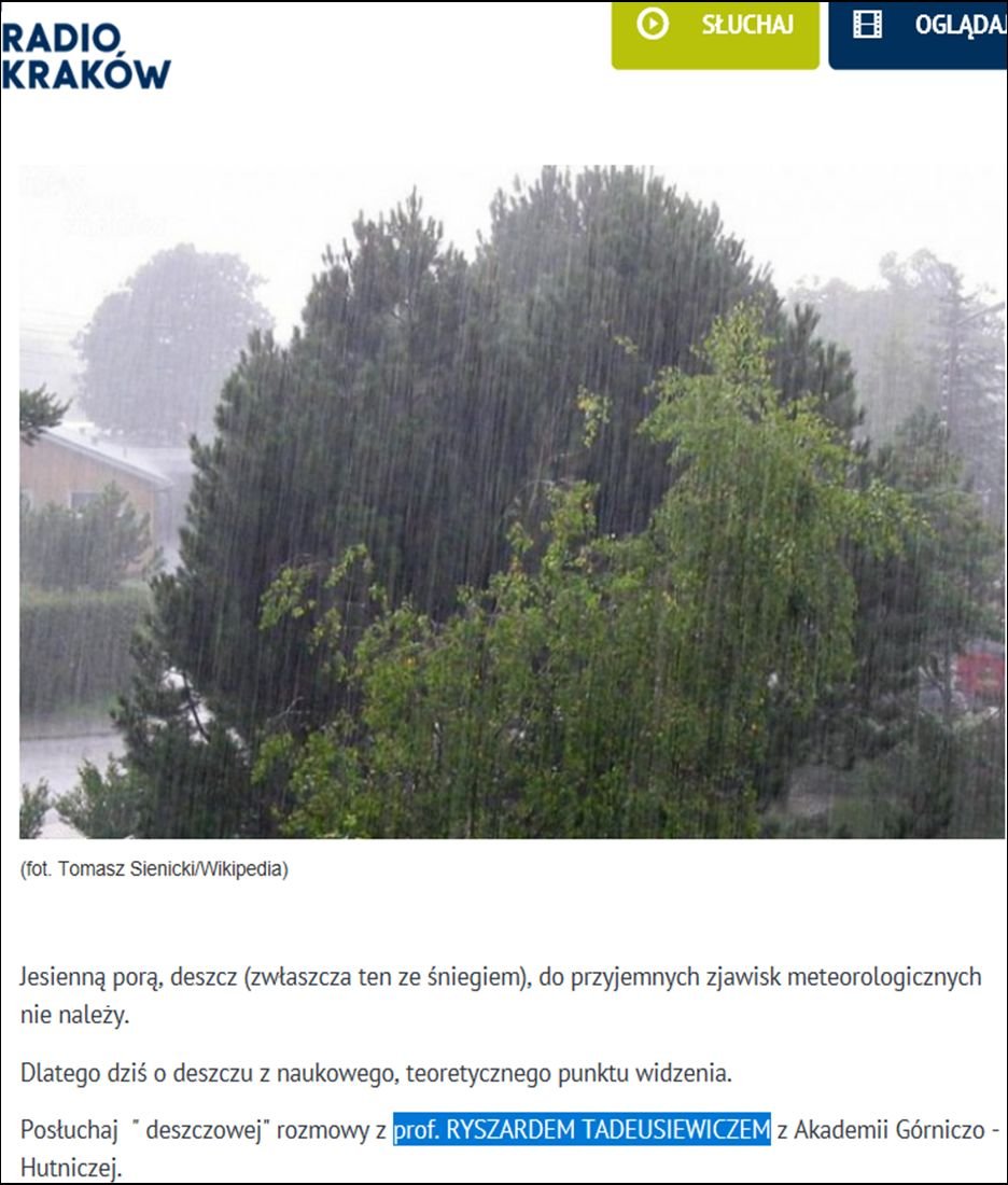 Po długim okresie ciepłej i słonecznej pogody nadeszły - niestety! - jesienne deszcze. Wiemy, że są konieczne, że bez nich zwiędły by rośliny i w kranach by zabrakło wody, ale trudno je polubić. Mam jednak dla Państwa propozycję: Zamiast tylko narzekać na deszcz - zechciejcie o nim posłuchać naukowo, bo opowiadam na jego temat różne ciekawostki w Radiu Kraków.