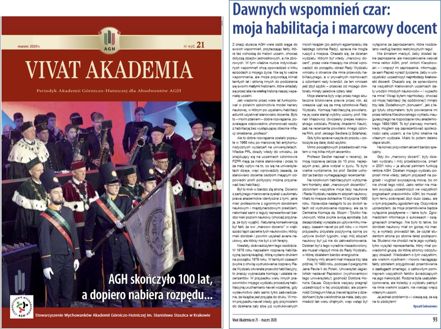 Otaczająca nas dziś rzeczywistość jest mało sympatyczna, więc chętnie uciekamy do wspomnień. W ostatnim (marcowym) numerze czasopisma "Vivat Akademia", wydawanego na AGH i kierowanego głównie (ale nie wyłącznie) do wychowanków tej uczelni, zamieściłem moje wspomnienia o tak zwanych "marcowych docentach". A zwłaszcza o jednym, który dążył do tego, żeby zniszczyć moją karierę naukową.