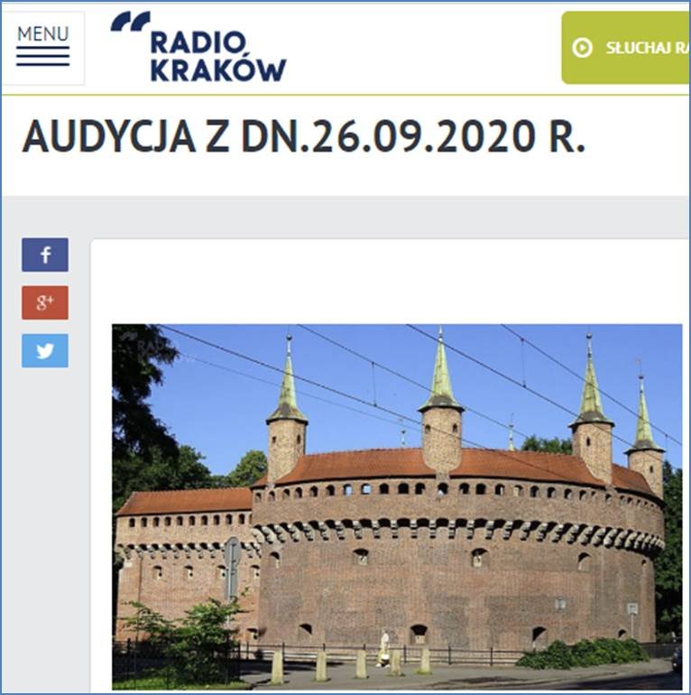 Wakacje minęły, ale pogoda jest ładna i sprzyja spacerom. Dla tych, którzy spacerują po Krakowie chciałbym wspomnieć o kilku mało znanych faktach związanych z naszym miastem. Opowiadam o nich na antenie Radia Kraków. Dzisiaj chcę zaprosić Państwa do wysłuchania audycji, która będzie emitowana w sobotę, 26.09.2020 o godzinie 16:05. Jest to nowy termin audycji "W kręgu nauki", która wcześniej była nadawana w niedzielę po hejnale.
