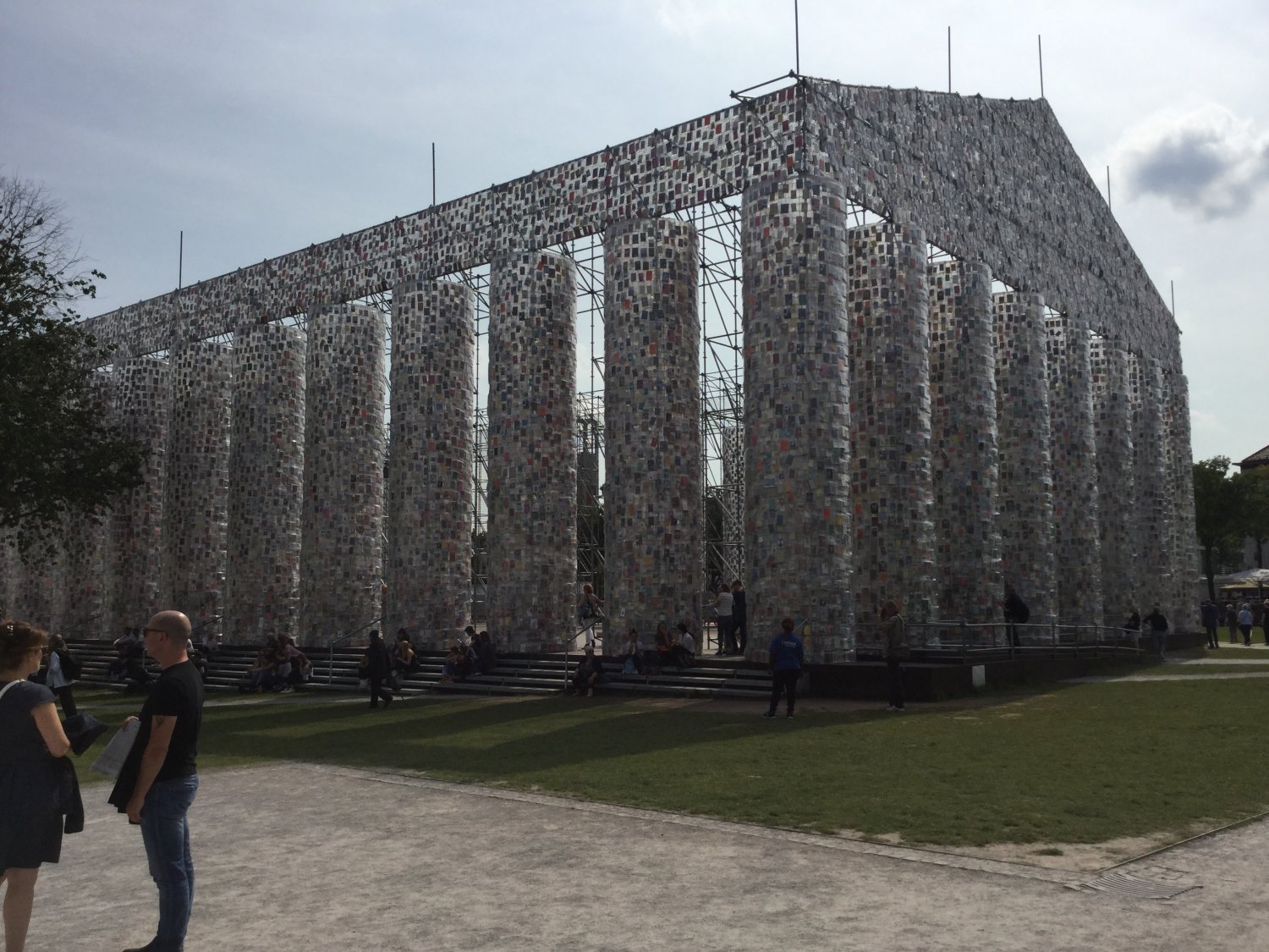 Najbardziej przykuwa uwagę ogromnych rozmiarów Partenon Marthy Minujín, zbudowany z książek zakazanych przez różne autokratyczne reżimy w XX wieku. Jest tam i Remarque, i Orwell, Sołżenicyn, Pasternak, Gombrowicz i wielu innych. Ale odniesień do okropności wojny, totalitaryzmów, wojen, problemów z uchodźcami jest mnóstwo. Sergio Zevallos z instalacjami "A War Machine" przeraża siłą i pomysłowością przemocy. Rysunki Adama Broomberga i Olivera Chanarin "The Prestige of Terror" to fotografie wojny bez obrazu. Na pytania, "Czym jest demokracja", "Co z tą demokracją", które padają w video Olivera Resslera, odpowiadają aktywiści z Moskwy, Amsterdamu, Berlina, Budapesztu, Londynu, Warszawy, Paryża. Czy różnią się te odpowiedzi? Nie. A na fasadzie Fridericianum Banu Cennetoğlu zastąpiła nazwę muzeum napisem „BEINGSAFEISSCARY” - bycie bezpiecznym przeraża. Mogłabym tak wyliczać.
