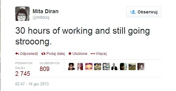 Mita Diran na jednej szali swojego życia stawiała wyjścia do klubów, wyjazd na urlop do domu, książki i dobre jedzenie, na drugiej zaś ścigające ją deadliny i adrenalinę, nadgodziny, brak snu i wymuszoną kreatywność o 1 w nocy. Granica oddania korporacji coraz mocniej przesuwała się w stronę całkowitego zatracenia. 30 października zauważyła, że "wszystkie jej tweety brzmią, jakby były zmęczone". Jaki znalazła sposób na sen? „Im więcej czasu spędzasz w pracy, tym częściej rozważasz przeniesienie tu swojego łóżka” – żartowała. Wymarzone wakacje, powrót do domu po 3 miesiącach nieobecności – 8 dni urlopu. Dla pracownika agencji reklamowej to istna utopia.