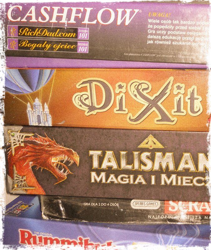 Popołudniowym rytuałem jest wspólna sesja gier z synami. Codziennie mamy coś innego. Dixit wspaniale rozwija ich wyobraźnię. Szukamy nieoczywistych metafor, ukrytych znaczeń, szczegółów w kartach z rysunkami. Cashflow – choć dla młodszego z chłopców wciąż za trudne – daje wspaniałe emocje, refleksję nad marzeniami i uczy zdrowego podejścia do pieniędzy. Wysokie napięcie bawi, pobudza nutkę rywalizacji, ale uczy też podejmować racjonalne decyzje, szukać okazji. Talisman (Magia i Miecz), to z kolei wielka przygoda… Na swój dzień czeka jeszcze Agricola i Kolejka. Zawsze są jeszcze Scrabble, Rummikub czy Szachy. Zresztą akurat zaczynają się wyprzedaże i może coś fajnego jeszcze upolujemy.