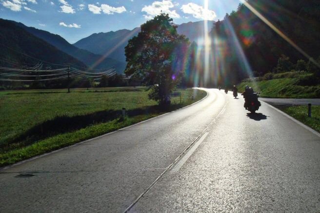 Na motocyklach siedzieliśmy już ponad 7 godzin, od organizatora słyszeliśmy wciąż tę same słowa: "jeszcze 200 km". Zaczęło nas to niepokoić, gdy naszym oczom ukazał się znak „granica włoska”… a to już był trzeci taki komunikat dzisiaj. Około godziny 17:00 zjechaliśmy z autostrady i wjechaliśmy w piękną dolinę… otaczały nas góry, a trawa była tak nienaturalnie zielona... Nie wiedzieliśmy czy to jawa czy sen. Co ciekawe na drodze było coraz więcej motocyklistów, był to znak, że zbliżamy się do raju dla bikers'ów - czyli „Zakrętolandii”. Pokonywaliśmy pierwsze agrafki, które po przejechaniu 700 km przysparzały przyspieszonego bicia serducha i co ciekawe nie tylko mnie.