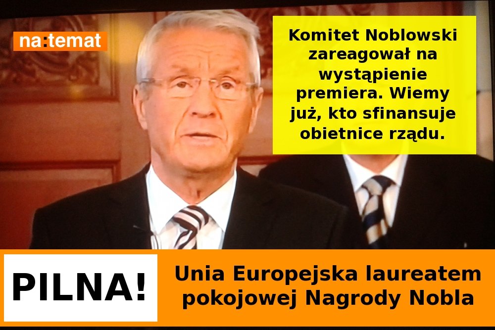 na:TematWiadomościKomitet Noblowski zareagował na wystąpienie Donalda TuskaWitten w obrazkach 12 października 2012, 11:16·1 minuta czytaniaPublikacja artykułu: 12 października 2012, 11:16 Anna Wittenberg / naTemat Pokojową Nagrodę Nobla otrzymała Unia Europejska.REKLAMA Witten z dostawą na TwitteraObserwuj @annawitten Nie przegap żadnej ważnej wiadomości i obserwuj nas w Google News! Więcej: Unia EuropejskaGrafikaNobel1Udostępnij: 1 Witten w obrazkachObserwuj Witten w obrazkachObserwujdziennikarka naTemat