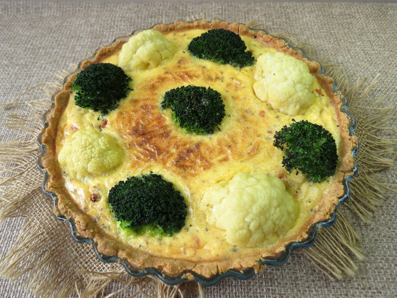 Masę serowo-jajeczno-śmietanową wylewamy ostrożnie na podpieczony spód tarty. Na wierzchu układamy różyczki kalafiora i brokułów. Wkładamy do rozgrzanego piekarnika i pieczemy ok. 30 min w temperaturze 170 stopni aż tarta się lekko zarumieni.