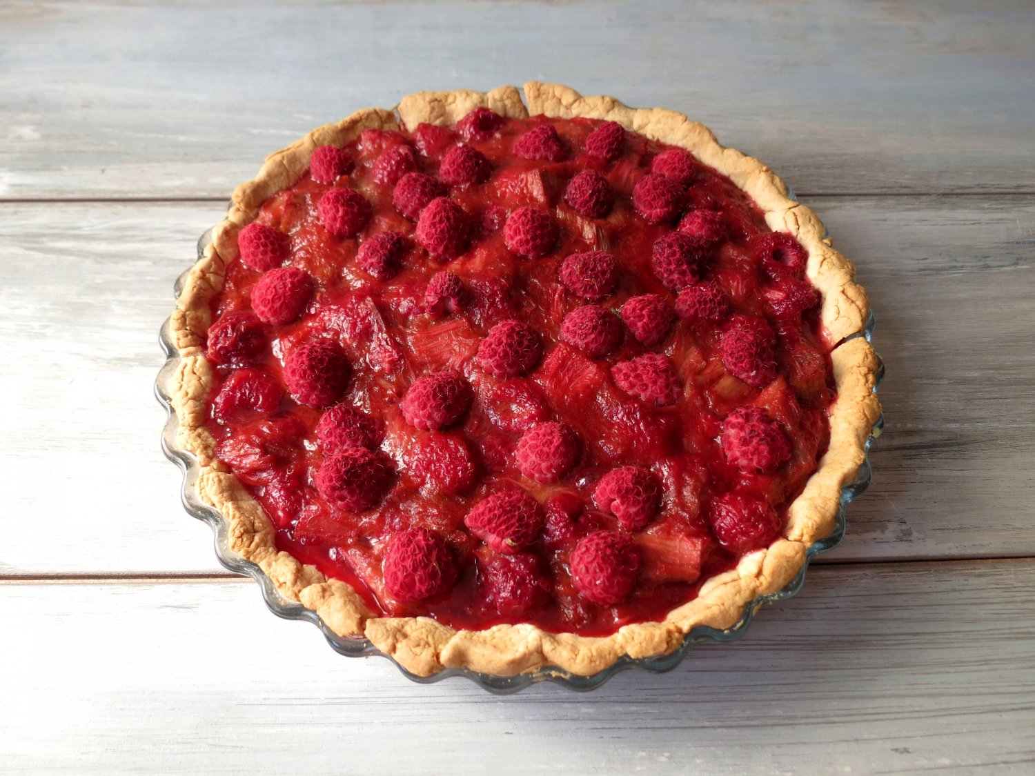 Z rabarbarem żegnamy się zatem, z jego cierpkością wykręcającą zęby, z jego warzywno-metalicznym posmakiem. Żegnamy się z rabarbarem w towarzystwie malin, które wraz nim posłużyły nam do przyrządzenia słodko-kwaśnej tarty. Maliny towarzyszą naszemu rabarbarowi nie tylko dla smaku i koloru, ale także dzięki odległej asocjacji z przypadkowo zasłyszaną rozmową dwóch amerykańskich turystów, którzy w jednej z naszych ulubionych kawiarni wpatrywali się intensywnie w malinowo-rabarbarową tartę, próbują odgadnąć, co to za dziwny owoc zdobi upatrzony przez nich deser. Wreszcie po chwili namysłu i konsultacjach on-line przy pomocy iphona jeden z nich wykrzyknął do swego towarzysza: „Look, this is raspberries and rhubarb!”. Ten soczysty dźwięk głębokiego wibrującego „r” prosto ze Środkowego Zachodu, tak bardzo utkwił nam w pamięci, że połączenie malin z rabarbarem wydaje nam się teraz zupełnie naturalne.