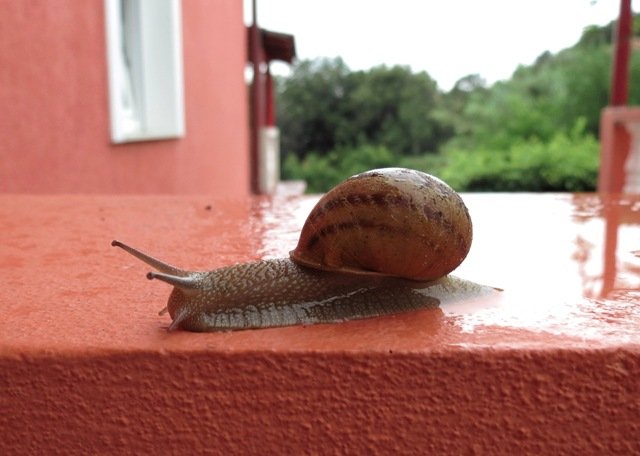 No i doigraliśmy się. Narzekaliśmy na polskie lato, na zimne wieczory i mokre poranki. Czekaliśmy z utęsknieniem wakacji, żeby wyrwać się nad skąpany słońcem Adriatyk. Przygotowaliśmy lekkie, przewiewne ubrania, kremy do opalania z sub-blockiem, przeciwsłoneczne okulary i czapki. Wstajemy dziś rano, a tu deszcz. Może nie tak dżdżysty, jak nasz deszcz bałtycki, ale jednakowo mokry. Gdzie okiem nie sięgnąć sine niebo i równie chmurne spojrzenia zaskoczonych, podobnie jak my turystów. Tylko okazały, chorwacki ślimak, który mieszka w naszym ogrodzie, sunie zadowolony po balustradzie naszego tarasu najwyraźniej zadowolony niespodziewanie dobrym poślizgiem, jaki dzięki spadającym z nieba kroplom udało mu się uzyskać.