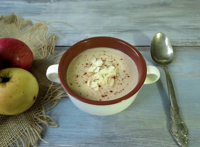 Obrać owoce, usunąć gniazda nasienne i pokroić w plastry. Obsmażyć na oleju na kolor złoty, a następnie obgotować w mleku. Zmiksować dokładnie, doprawić przyprawami. Dzięki dodatkowi dojrzałych gruszek, możemy zupy nie dosładzać cukrem, ale jeśli ktoś lubi bardzo słodko, może trochę dodać. Zupę można jeść na gorąco i na zimno, a przed podaniem na talerzu najlepiej posypać ją szczyptą cynamonu i płatkami migdałowymi.